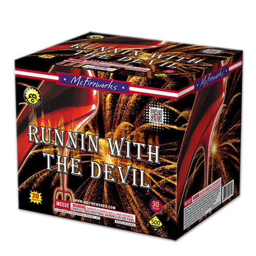 Running with the Devil is a 20 shot 500g cake with these cool effects: Brocade crown with red strobe,Ti gold palm with white strobe,Red blue star with white strobe,Brocade crown with red blue star