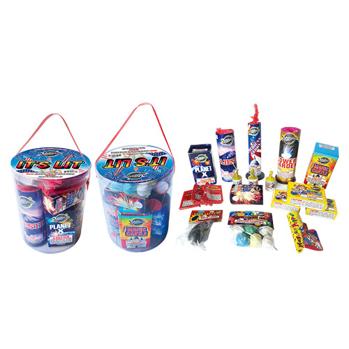 Family pack in a bucket. It contains all kinds of fountains, snappers, party poppers, smoke balls and 16 counts firecrackers.