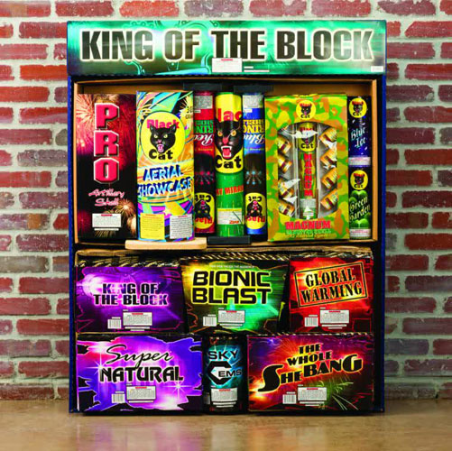 The KING OF THE BLOCK from Black Cat is a great mix of huge cakes and great artillery. This monster is over 4 feet tall and 4 feet wide! Geared toward the serious fireworks enthusiast who wants the best show on the block! You have to see this to believe it! Come by and see it in person at your San Antonio Area Blazing 7 Fireworks location.