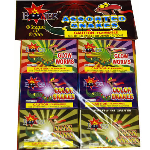 A new version of a real fireworks classic. Each pack contains six boxes with six snakes in each box. Assortment includes two boxes of black snakes, two boxes of glow worms, and two boxes of colored snakes. This family favorite offers some of the best colored snakes on the market and include; green, yellow, orange and red snake versions.