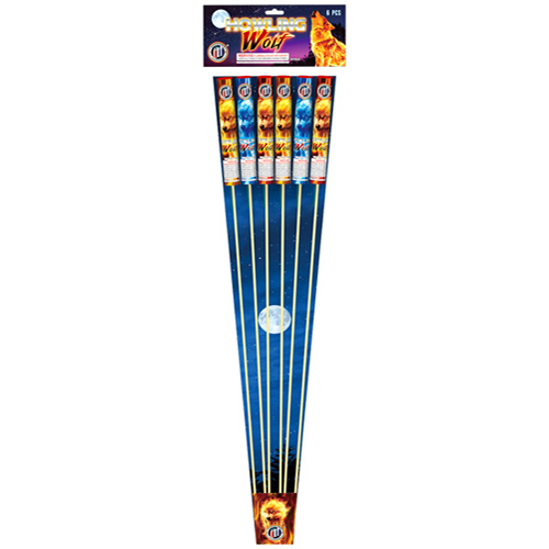 A 6 pack of rockets that each make a loud howl before bursting in a colorful brocade crown effect.