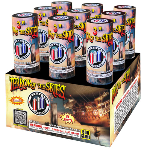 Terror of the Skies is a 3 inch 9 shot rack with huge burst and a whistling finale.
